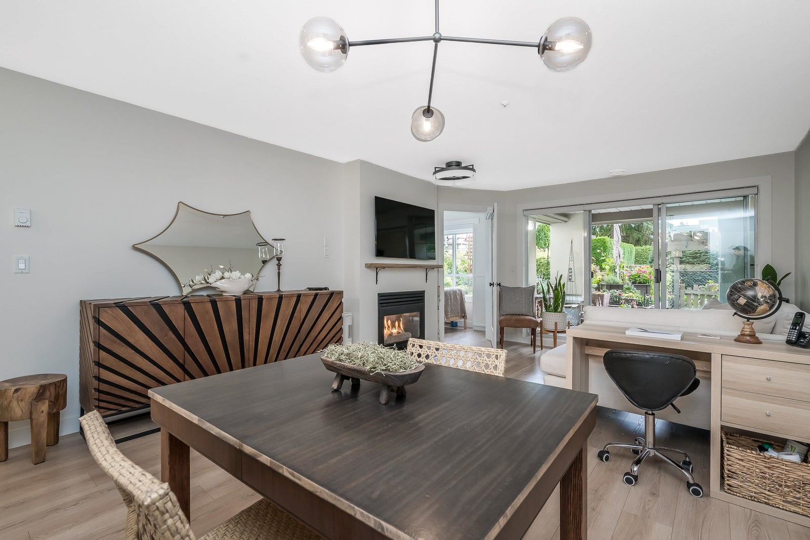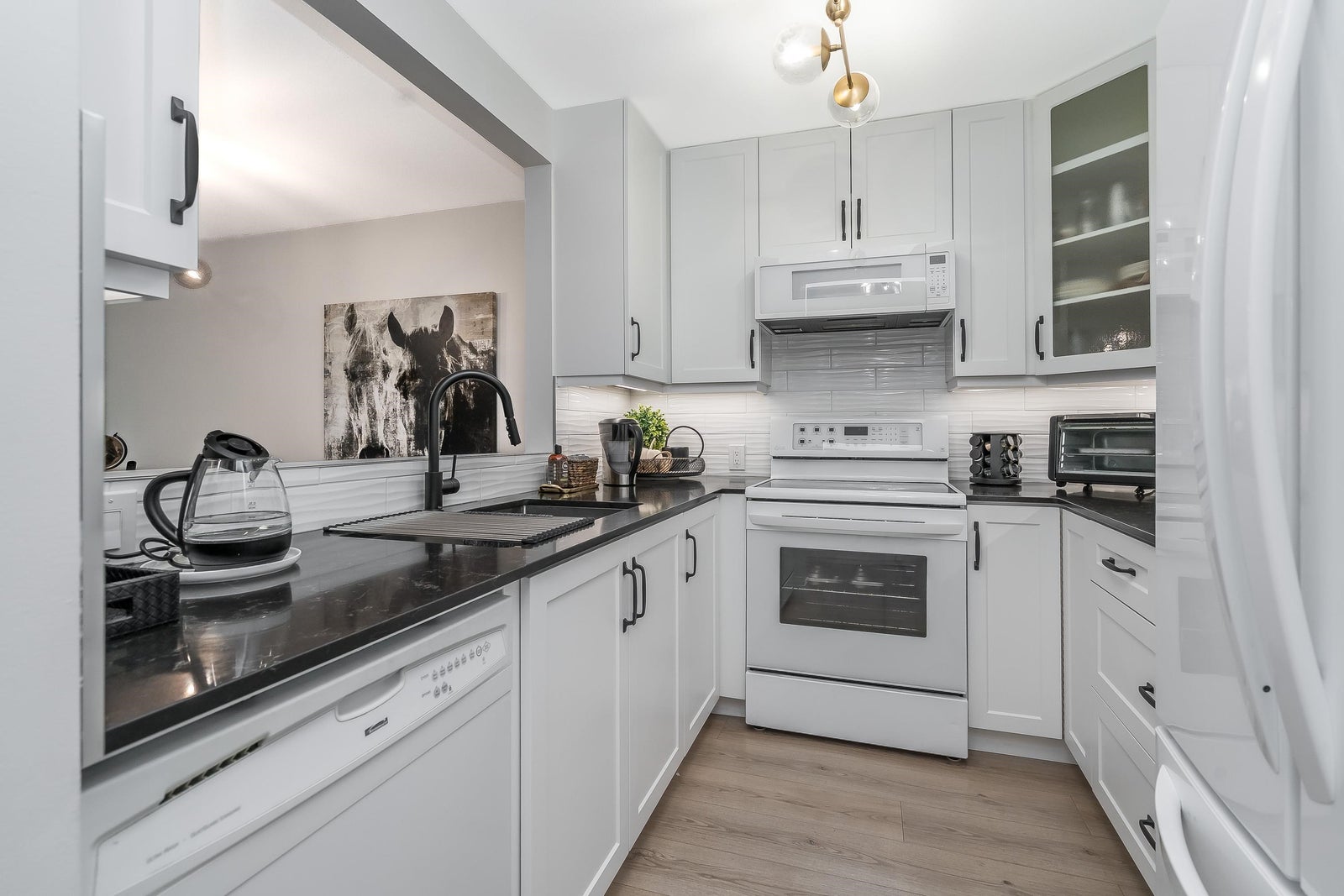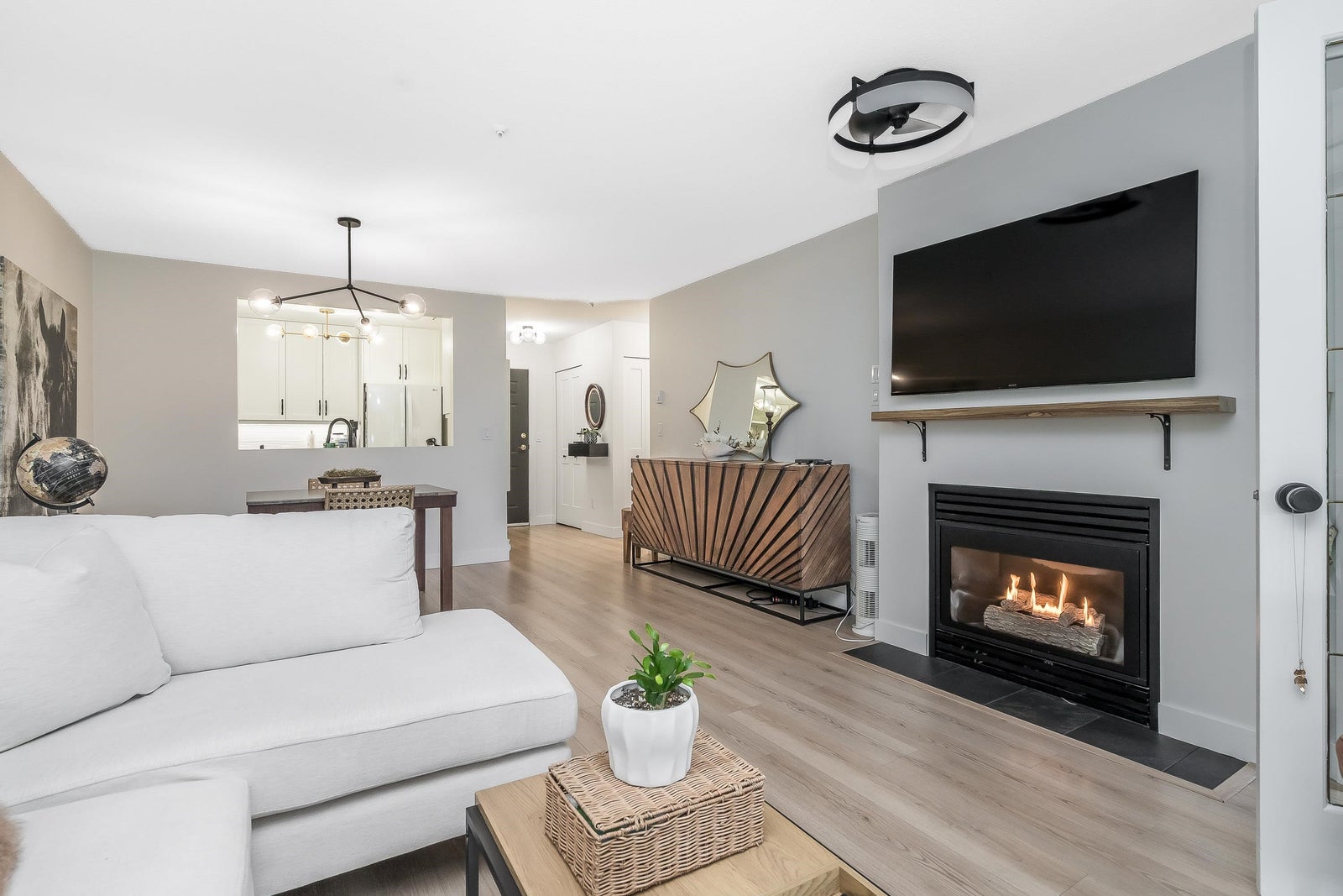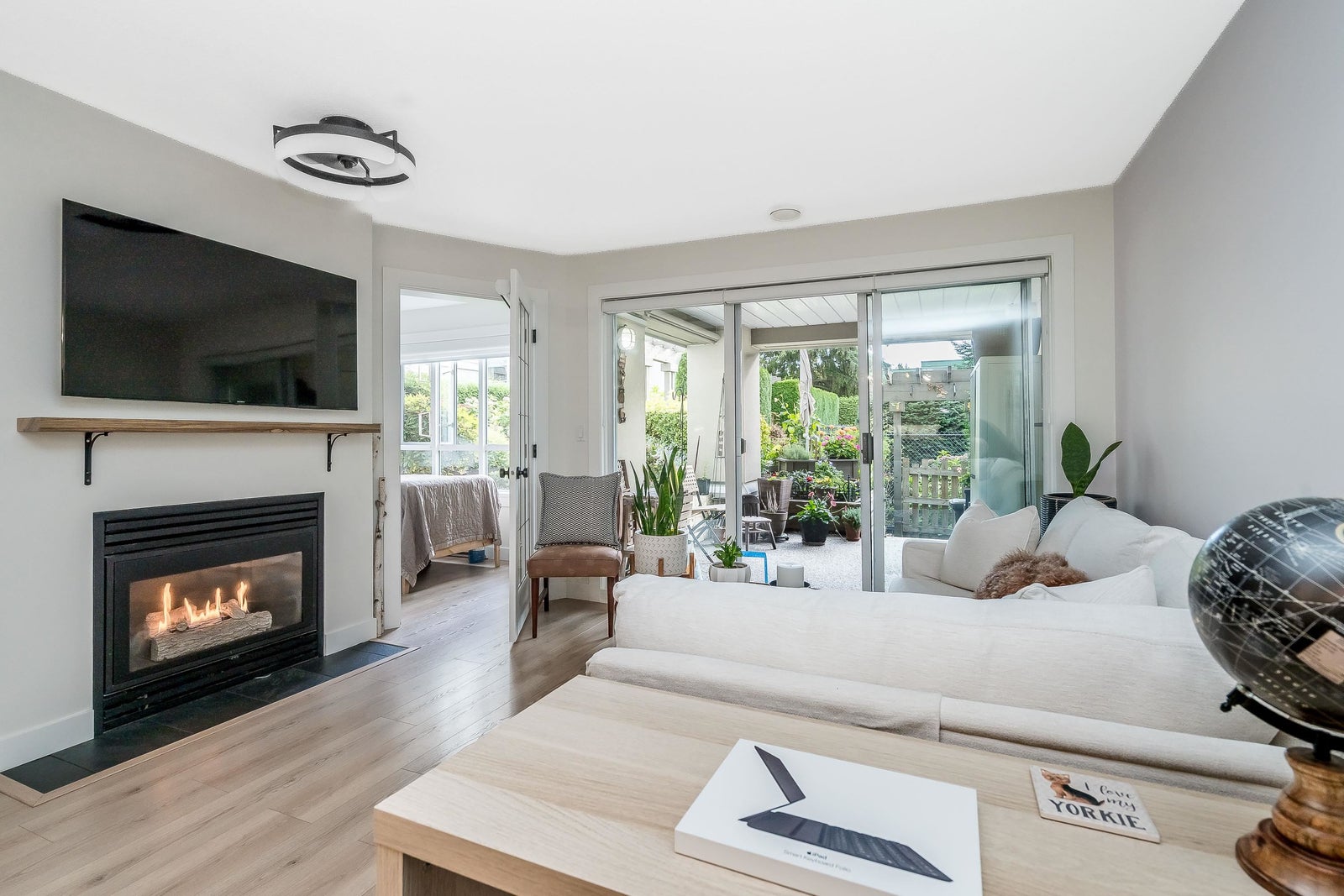 James Court – Ground-level luxury with no stairs from the lobby. This 2-bedroom garden walk-out home showcases $50K in high-end professional renovations. Garden view from both bedrooms. The kitchen features white maple shaker cabinets, under lighting, black quartz counters, undermount sink, custom tile backsplash, and upgraded lighting. Spa-inspired bath with maple vanity, quartz counter, ledging, new tub, fixtures, and full custom tile. High-end waterproof laminate, fresh neutral paint, 3-panel Silhouette shades on patio slider, and Silhouette blackout blinds to both bedrooms. No holes in walls—move-in ready. Cozy gas fireplace, secure parking, pet-friendly (1 cat/dog, 16”). Steps to Douglas Park community events and amenities. Decadent condo living—this may be your heart’s desire.