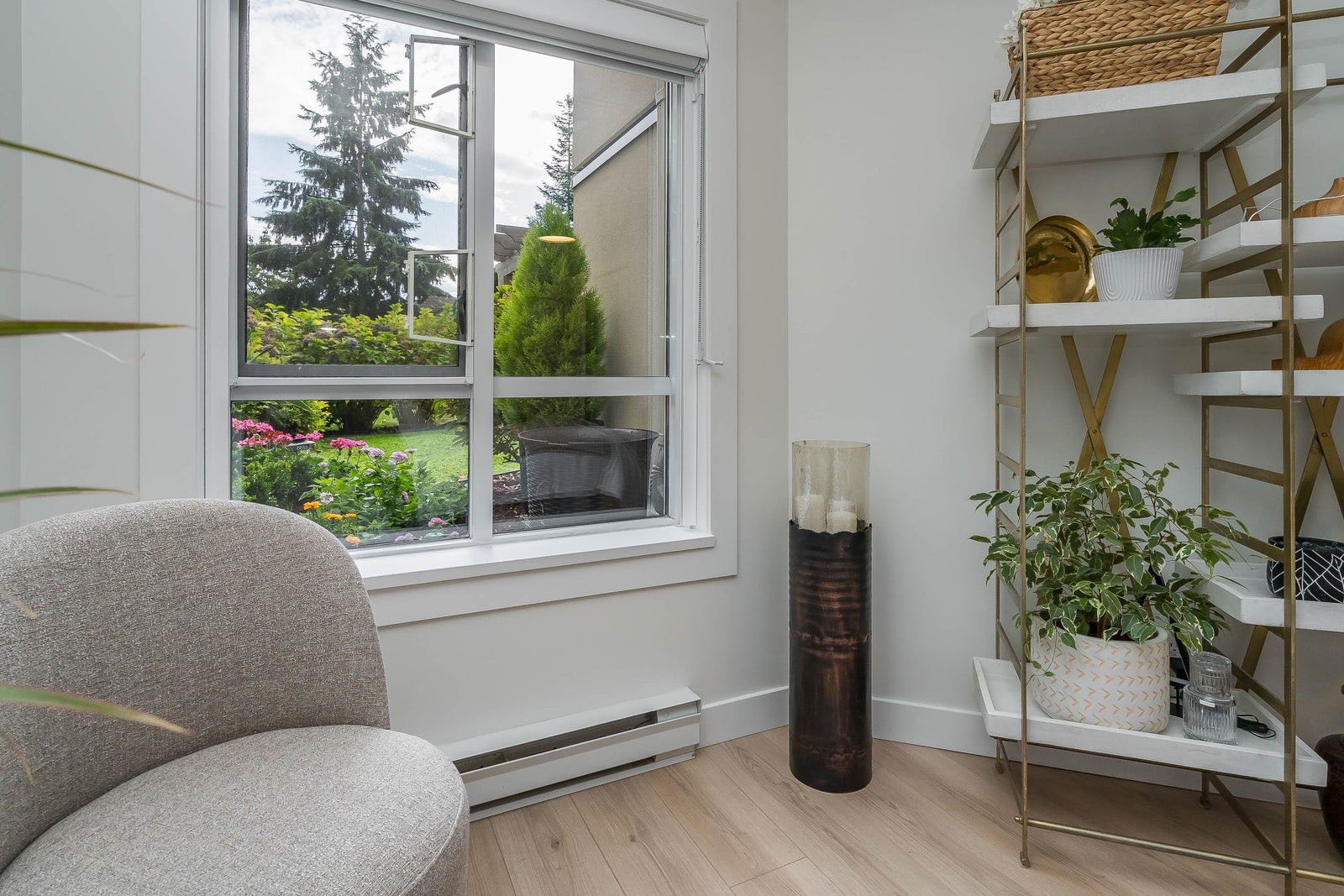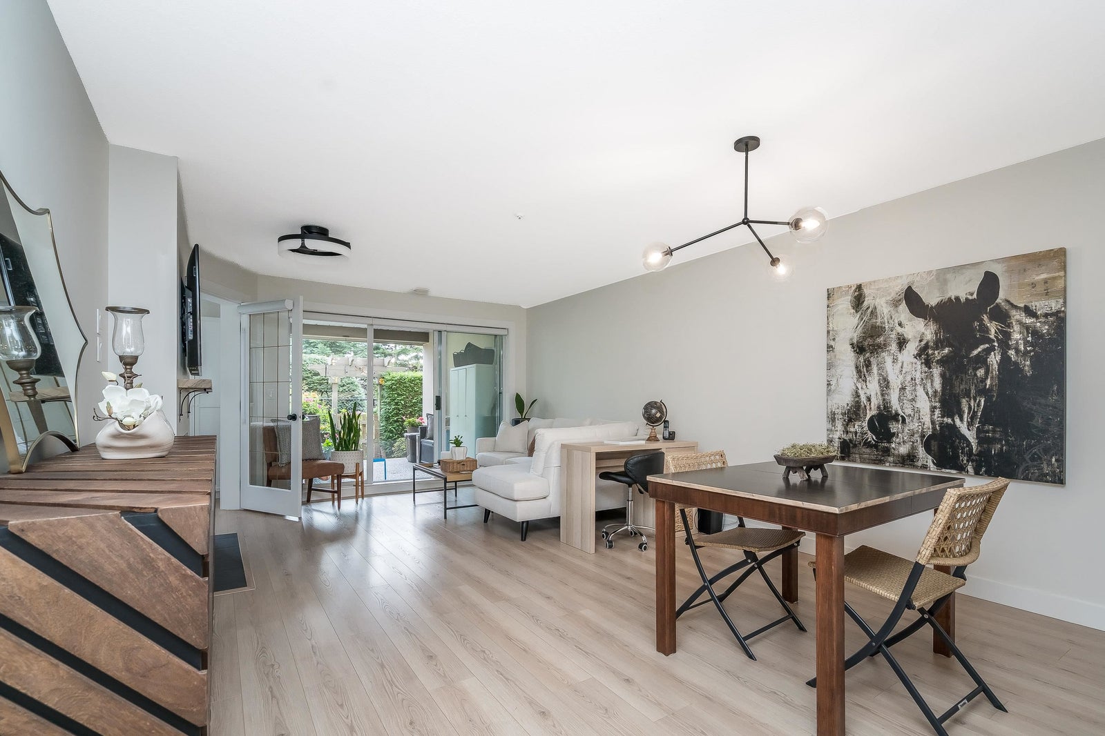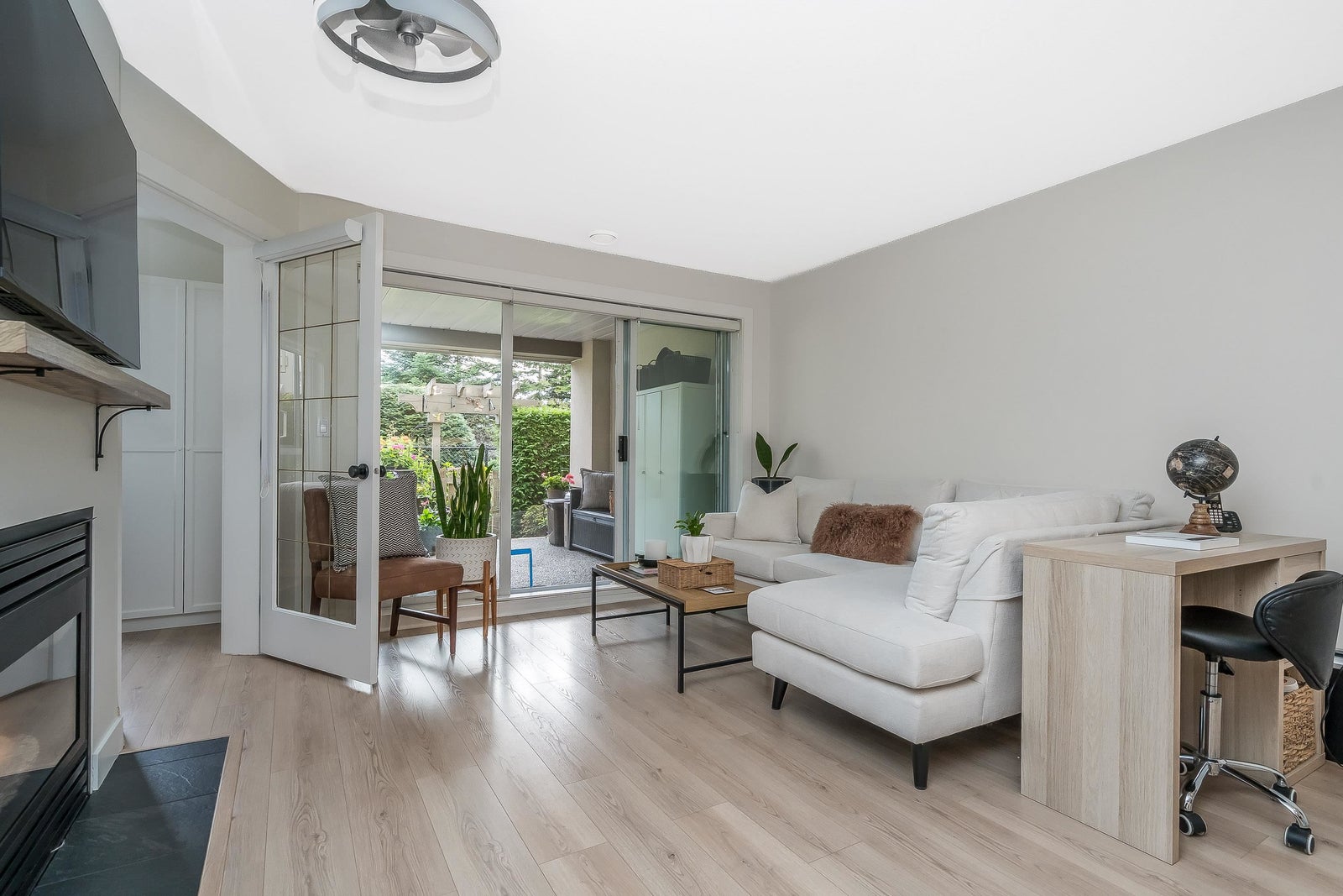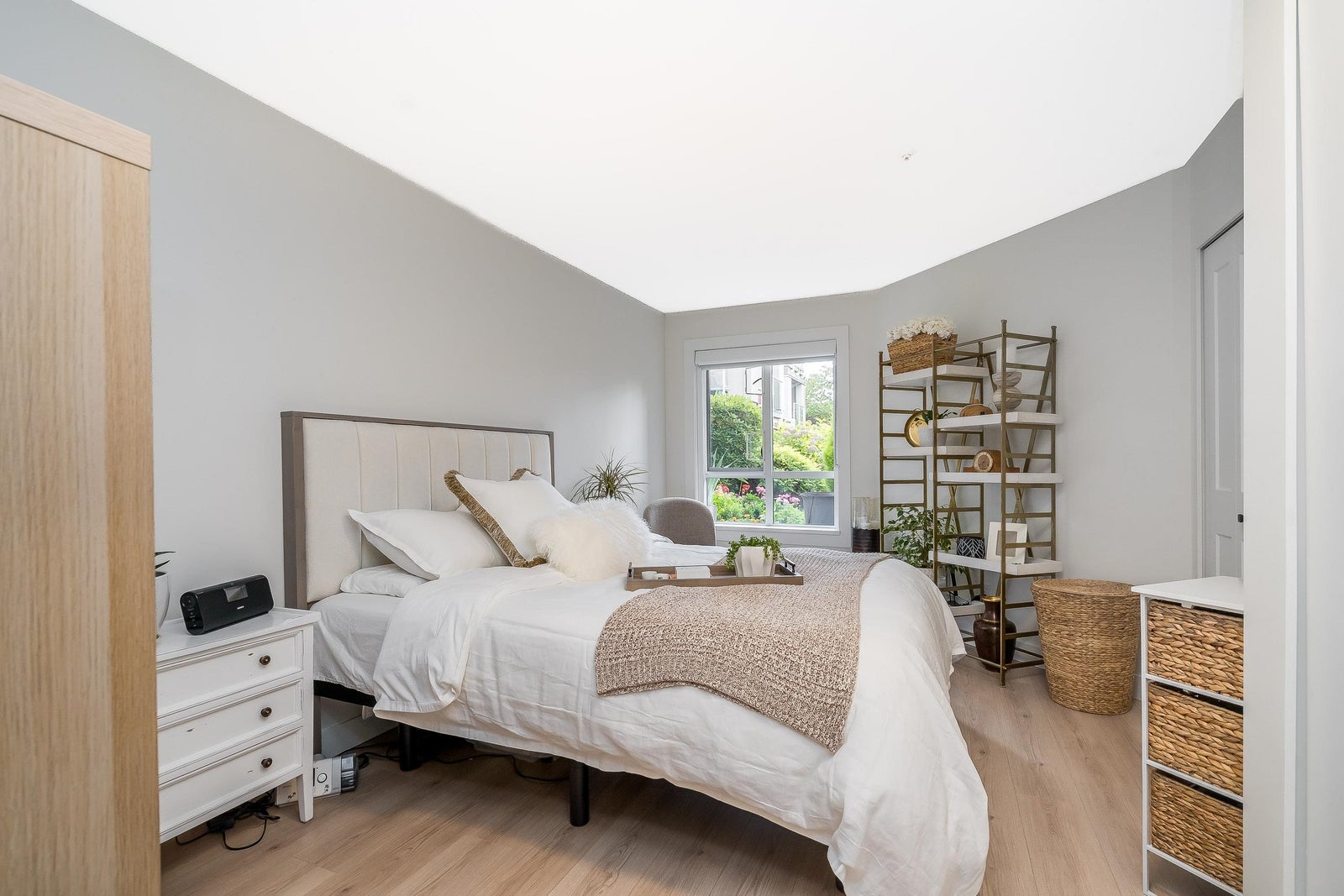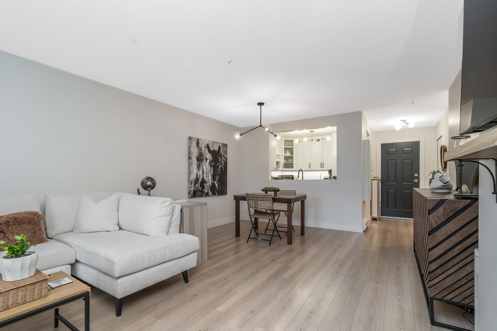 James Court – Ground-level luxury with no stairs from the lobby. This 2-bedroom garden walk-out home showcases $50K in high-end professional renovations. Garden view from both bedrooms. The kitchen features white maple shaker cabinets, under lighting, black quartz counters, undermount sink, custom tile backsplash, and upgraded lighting. Spa-inspired bath with maple vanity, quartz counter, ledging, new tub, fixtures, and full custom tile. High-end waterproof laminate, fresh neutral paint, 3-panel Silhouette shades on patio slider, and Silhouette blackout blinds to both bedrooms. No holes in walls—move-in ready. Cozy gas fireplace, secure parking, pet-friendly (1 cat/dog, 16”). Steps to Douglas Park community events and amenities. Decadent condo living—this may be your heart’s desire.